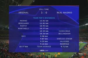 全场跑动数据:阿森纳平均比皇马多1km,前4都是枪手球员